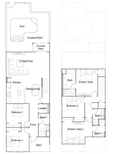 Este townhouse de dos pisos es el más grande de la colección. El primer piso cuenta con una sala de estar abierta con una puerta corrediza que conduce al patio cubierto y a la piscina privada. Hay dos dormitorios en el primer piso y tres en el segundo, incluidas las suites dobles.
