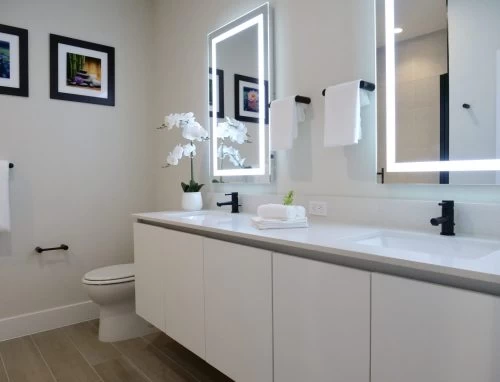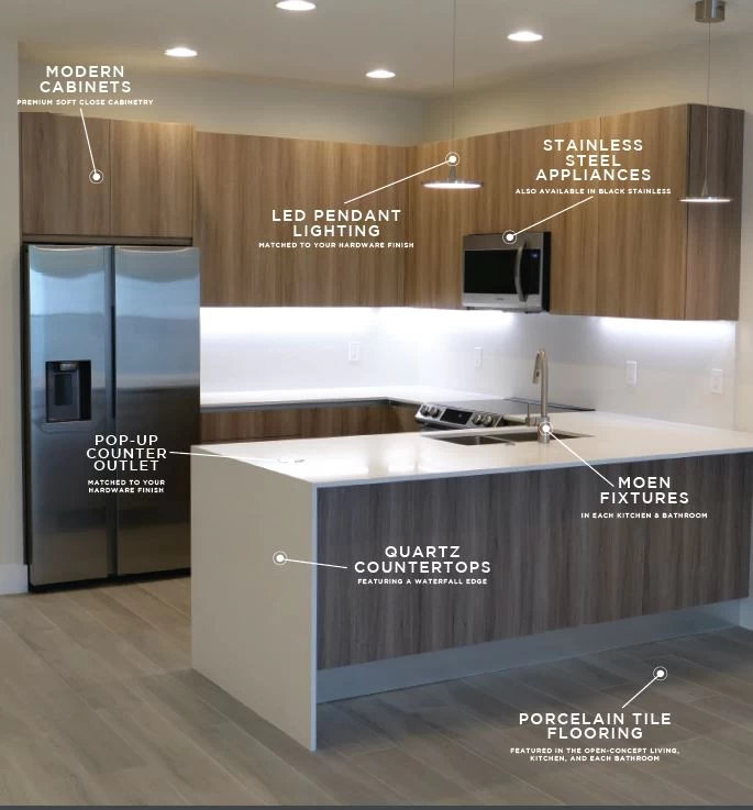 Dentro, poseen acabados de lujo, como encimeras de cuarzo premium, gabinetes modernos, pisos de porcelana y línea blanca de acero inoxidable.