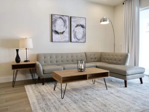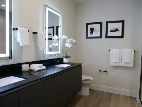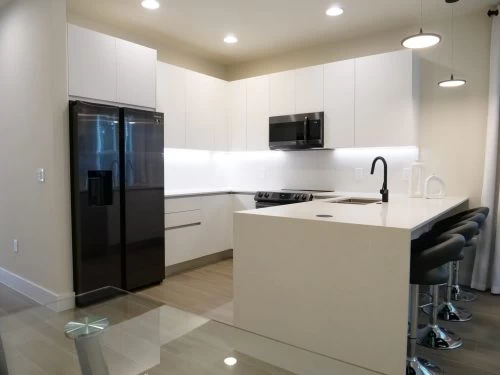 Cada cocina de Tranquility cuenta con impresionantes gabinetes modernos, encimeras de cuarzo de primera calidad, electrodomésticos de acero inoxidable y pisos duraderos de porcelanato.